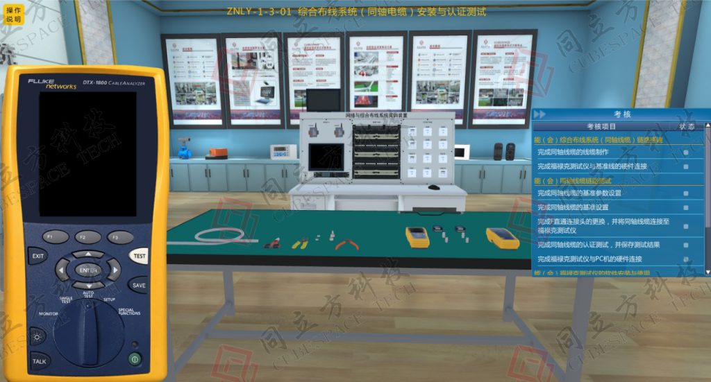 按真实综合布线系统实验台1:1三维仿真建模设计的虚拟仿真教学软件,该软件通过多物理建模及驱动技术,为场景化教学提供支撑。后台结合计算公式、算量算法、数据模型等算法,实验过程在3D环境下进行操作练习。可同时满足学生线上的学习与仿真训练;并通过数据信息交换,将过程评价考核纳入虚拟仿真系统中。
