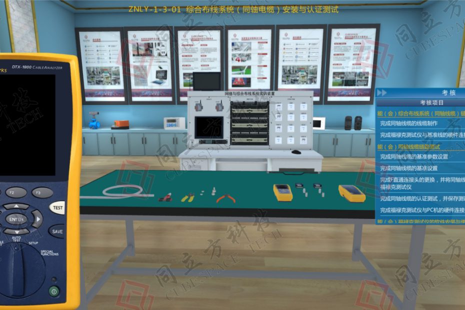 按真实综合布线系统实验台1:1三维仿真建模设计的虚拟仿真教学软件,该软件通过多物理建模及驱动技术,为场景化教学提供支撑。后台结合计算公式、算量算法、数据模型等算法,实验过程在3D环境下进行操作练习。可同时满足学生线上的学习与仿真训练;并通过数据信息交换,将过程评价考核纳入虚拟仿真系统中。