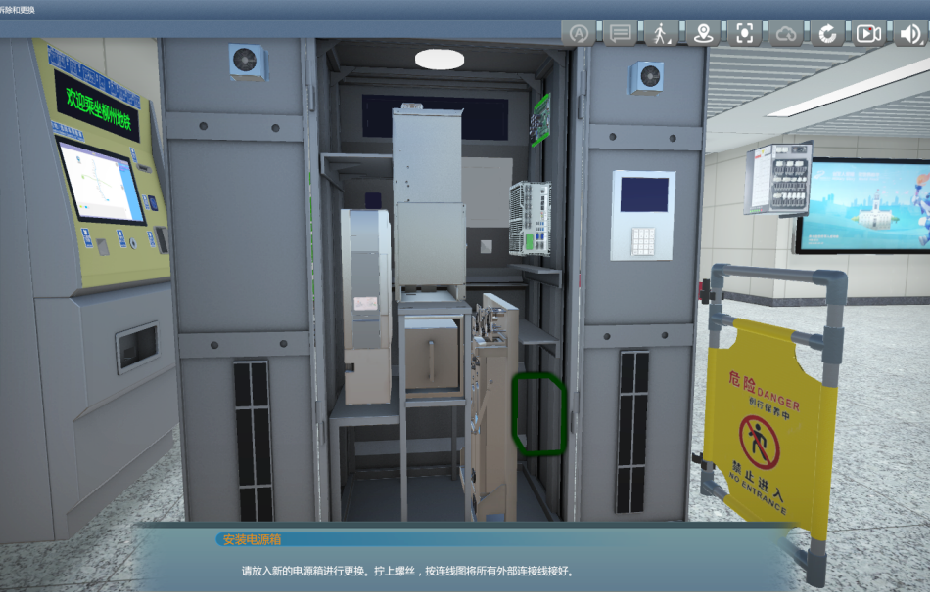 采用VR技术,建立建筑全景及周边地形地貌三维数据,各系统设备三维立体图像建模及工作原理三维动态模拟,展示整体城市地铁站(站厅层、站台层、设备用房)的三维信息。