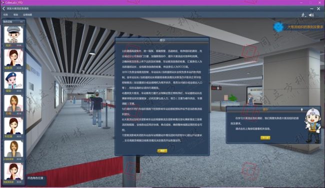 采用VR技术,建立建筑全景及周边地形地貌三维数据,各系统设备三维立体图像建模及工作原理三维动态模拟,展示整体城市地铁站(站厅层、站台层、设备用房)的三维信息。并且能够通过互动,实现三维场景各个角度的呈现以及建筑内部的虚拟漫游;并可以展示文字、视频以及3D交互展示等多媒体信息。通过VR头盔和操作手柄,以及VR表现和交互方式,让学生沉浸在仿真场景里,按步骤进行VR模拟操作。